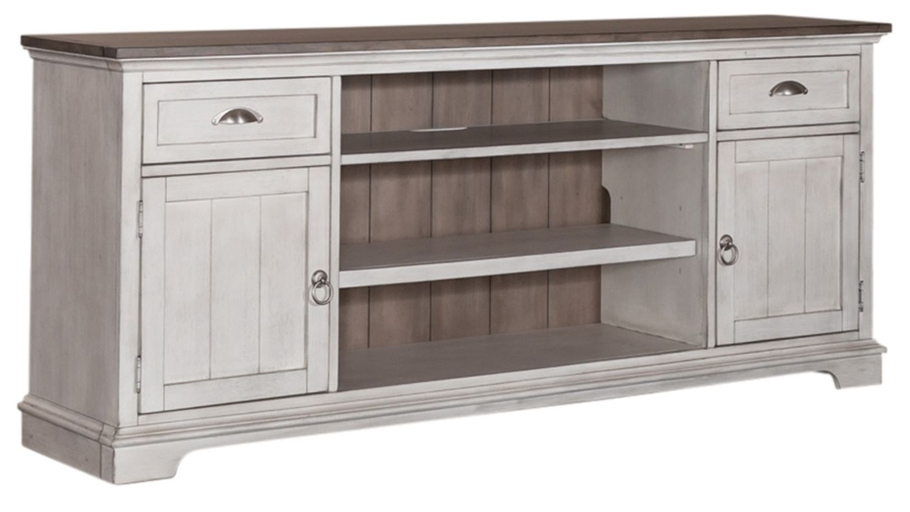 Capture the essence of the tranquility of the sea blended with the charm of a cozy cottage with the Ocean Isle 72" tv stand. This piece features a weathered pine top, planked back panels, adjustable shelving, fully stained interior drawers, anchored by bracket feet and accented by satin nickel cup and drop ring hardware.Read More