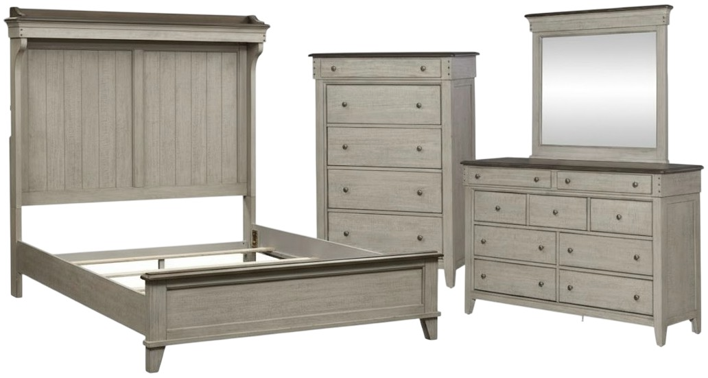 Create a relaxing retreat with the Ivy Hollow queen mantle bed, dresser, mirror and chest. This kit features full extension drawers with premium felt lined top and cedar lined bottom drawers, offset top drawers to create dimension, framed end panels, pin nail head accents, and antique pewter knob hardware.Read More